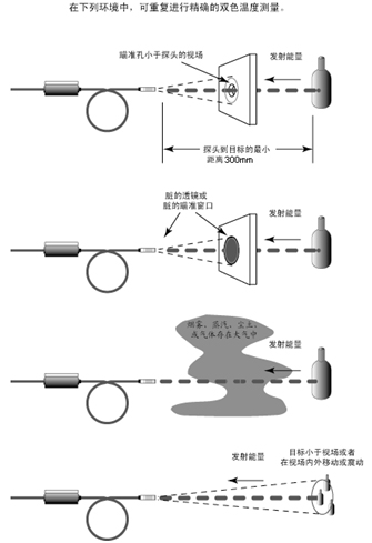 雙色測溫不會隨物體表面的狀態(tài)而變化(表面粗糙度不一樣、或表面的化學(xué)狀態(tài)不一樣),不會影響測溫的準確性,而單色測溫儀就會有影響。