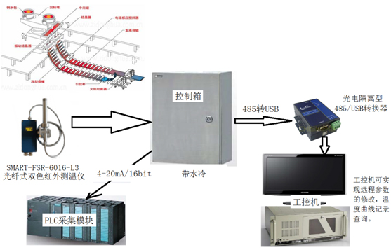 鑄坯的溫度很高、體積大,普通儀器的溫度只能達到85℃,一般推薦使用溫度小于50℃。即使采用軍工級產(chǎn)品也不能達到要求,必須選用光纖測溫儀,傳感頭和檢測器分開,傳感頭能夠承受250℃的高溫,不需要冷卻。檢測器安裝在環(huán)境溫度較低的場合,環(huán)境溫度較高時也可對檢測器進行水冷卻,這樣能夠極大地提高儀器的使用壽命。