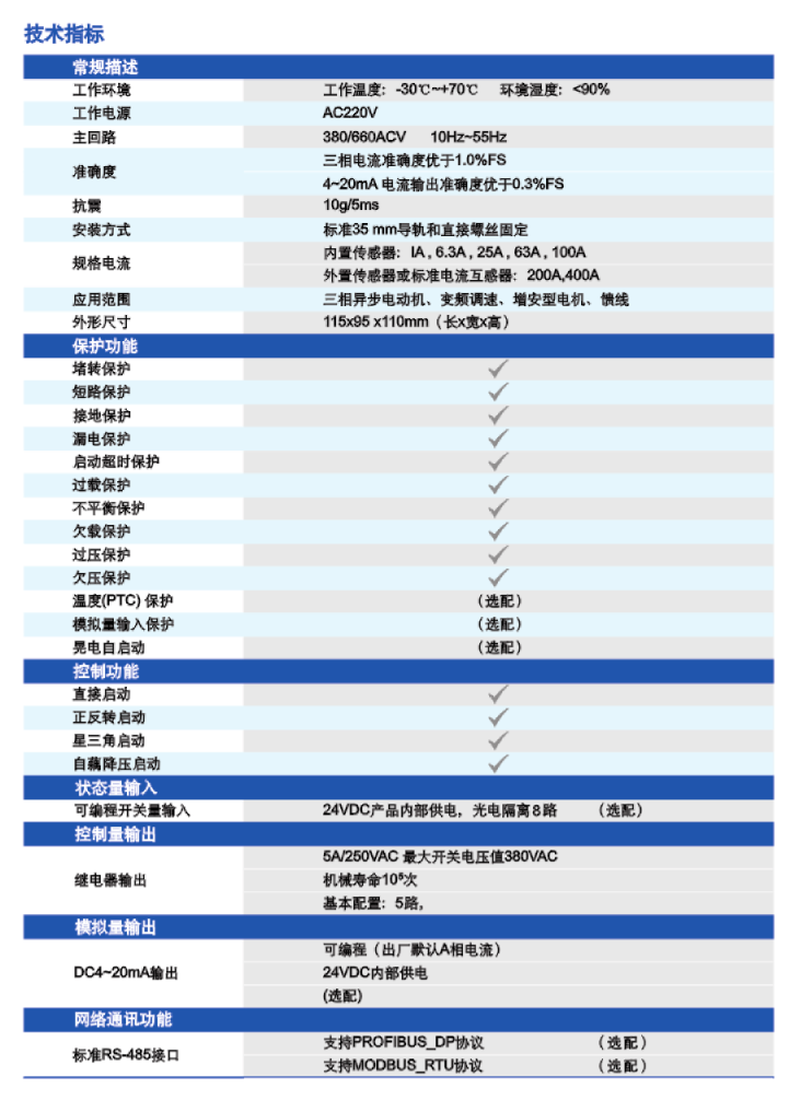 ★ 可對電動機(jī)進(jìn)行堵轉(zhuǎn)、短路、漏電、不平衡(斷相)、啟動超時、過載、欠載、過壓、欠壓、接地、PTC溫度等綜合保護(hù).