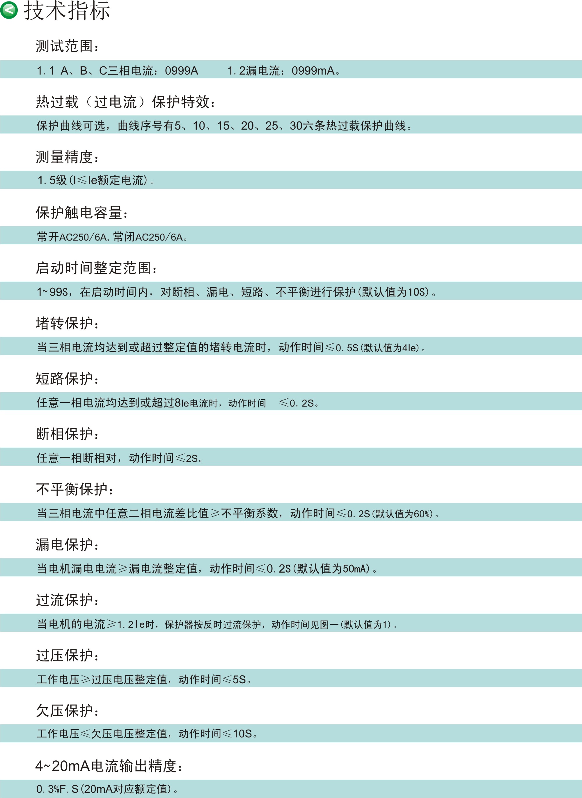 保護(hù)功能   過流保護(hù)、斷相保護(hù)、三相不平衡保護(hù)、堵轉(zhuǎn)保護(hù)、欠電壓保護(hù)、漏電保護(hù)、短路保護(hù)。