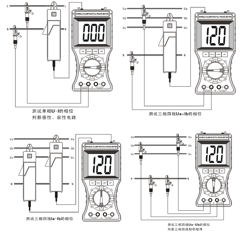 測(cè)U1-I2或I1-U2相位時(shí):10V~600V、10mA~20.00A |